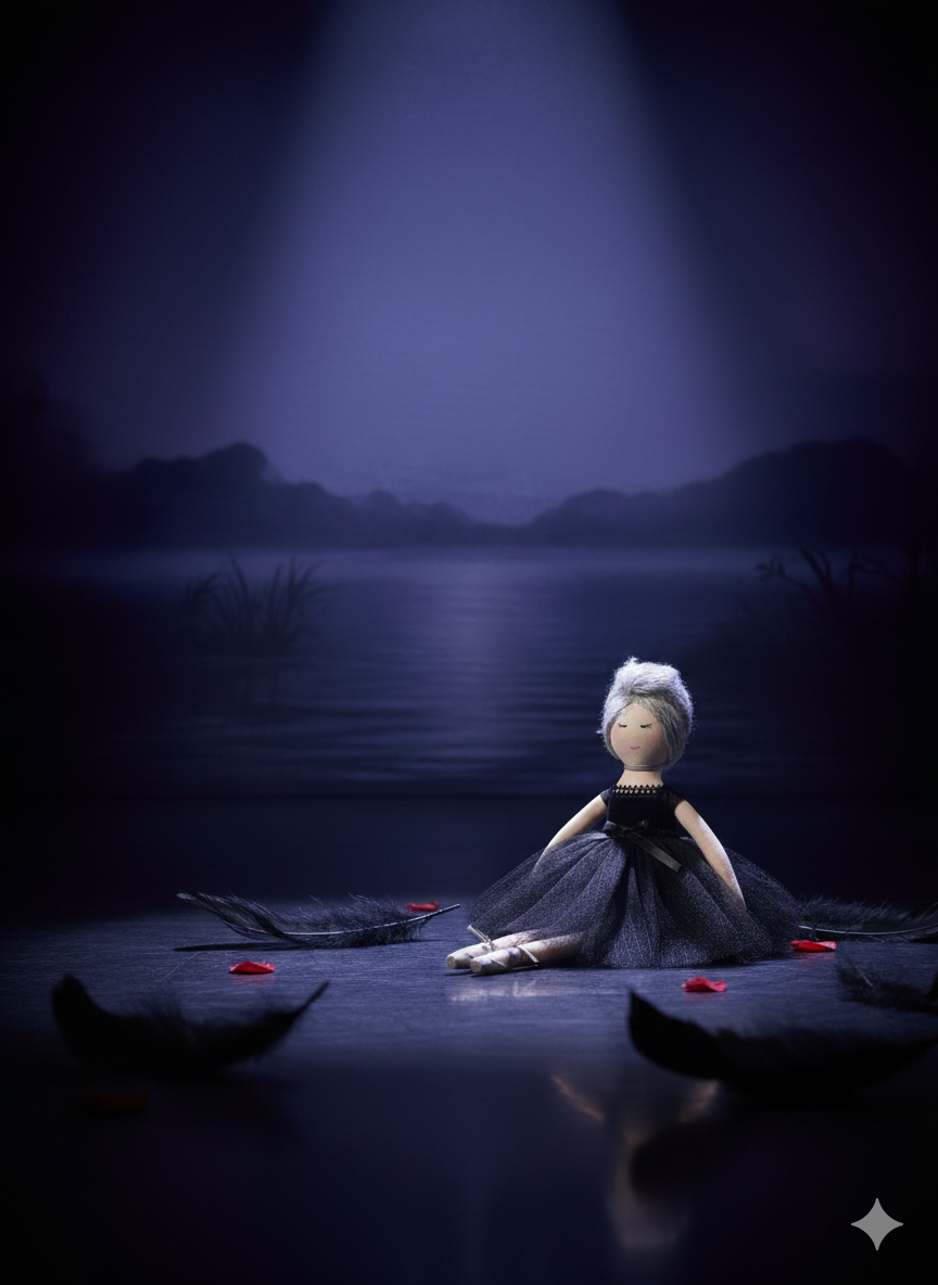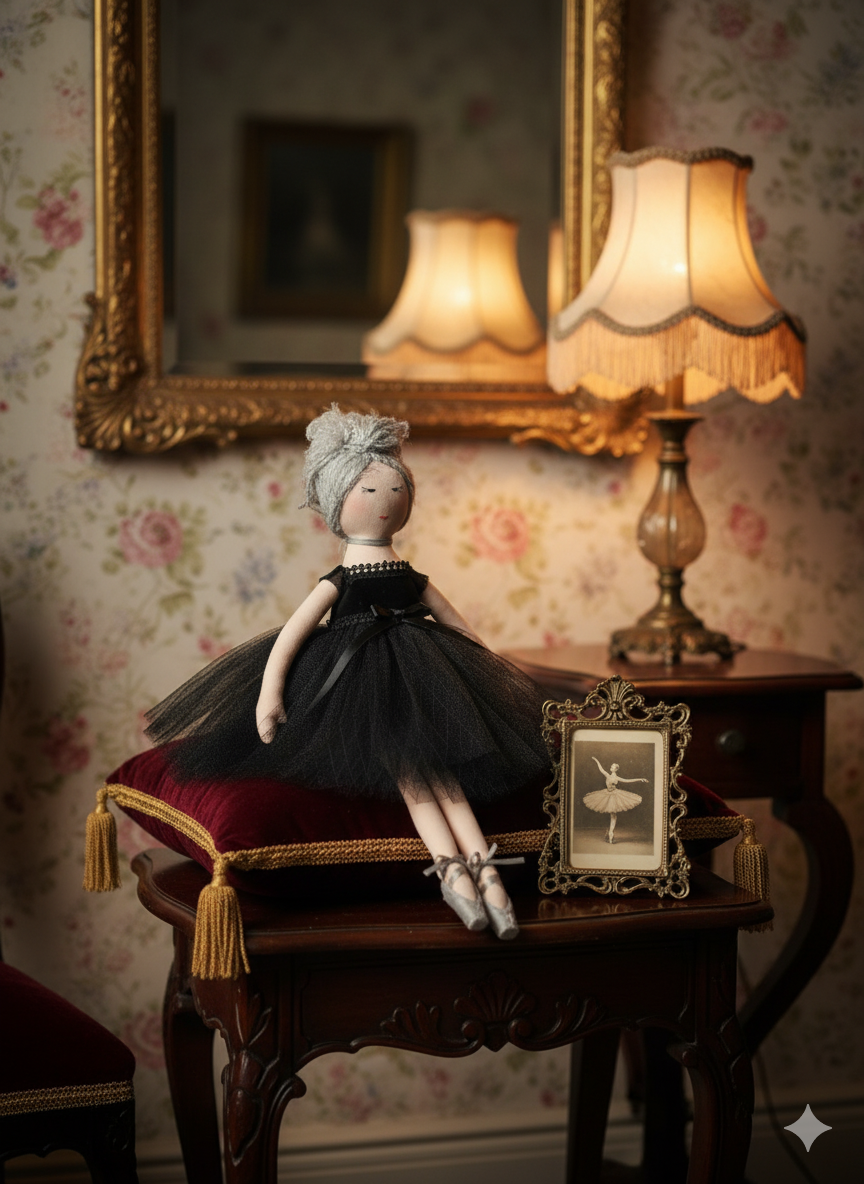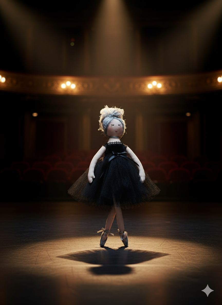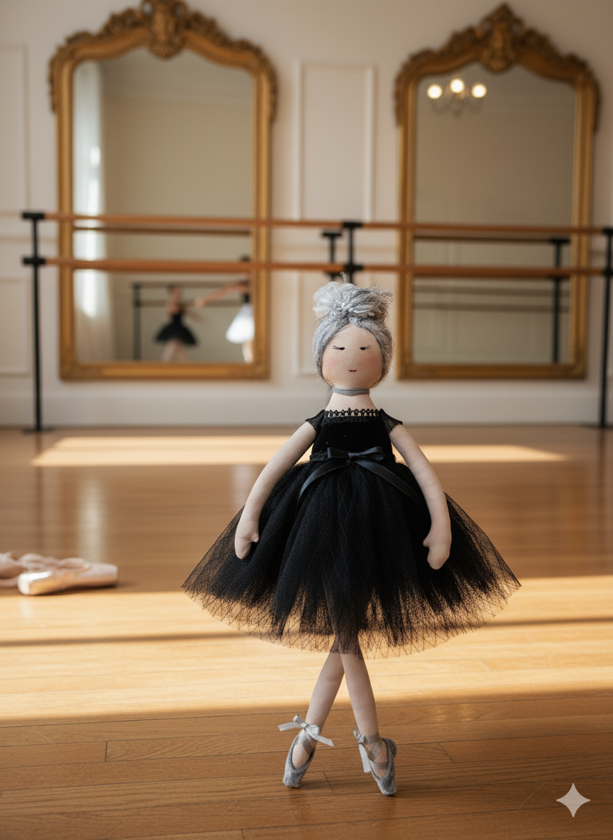 Introducing the Obsidian Swan, a sophisticated and graceful addition to any collection. This exquisite cloth doll embodies the classic elegance of ballet, with a gentle, hand-stitched face and an air of quiet concentration. Her soft, silvery-grey hair is swept up into a delicate bun, complementing her monochromatic ensemble. Giselle is dressed in a magnificent black tutu with a voluminous tulle skirt and a coordinating velvet-like bodice cinched with a satin ribbon. Her attention to detail extends to her feet, which are clad in shimmering grey satin pointe shoes tied with delicate white ribbons. Posed perfectly en pointe in a sun-drenched ballet studio, Giselle is a captivating piece that celebrates the beauty and discipline of the dance.