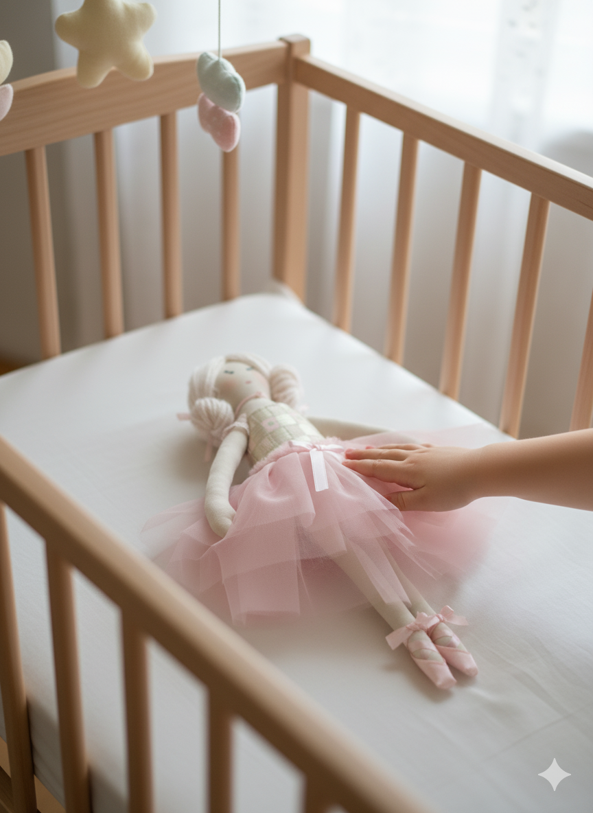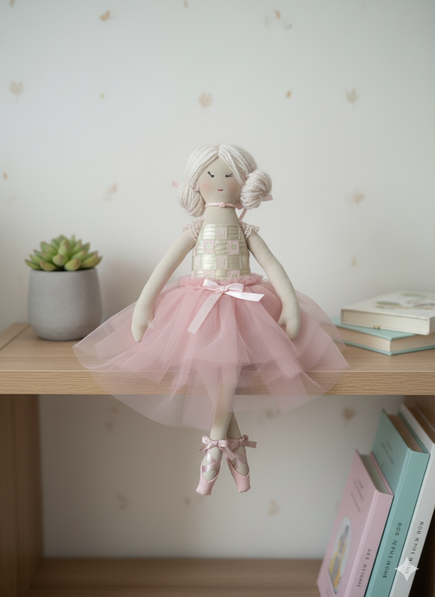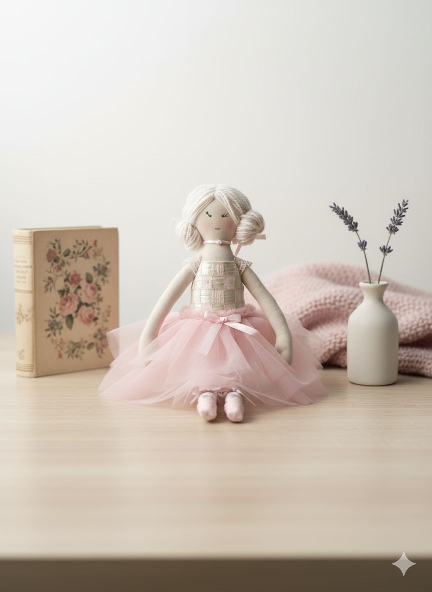 Presenting our elegant Pastel Pink Ballerina Doll, a vision of grace and charm. She has a serene expression and soft, light-pink hair styled in a delicate bun with a matching pink bow. Her top is a shimmering mix of pink and gold, with intricate lace trim at the neck. A beautiful satin ribbon cinches her waist above a flowing, multilayered tutu of pastel pink tulle. Her dainty feet are dressed in classic ballet slippers with ribbon ties. This doll is a perfect gift for any ballet enthusiast or collector, bringing a touch of gentle elegance to any space.