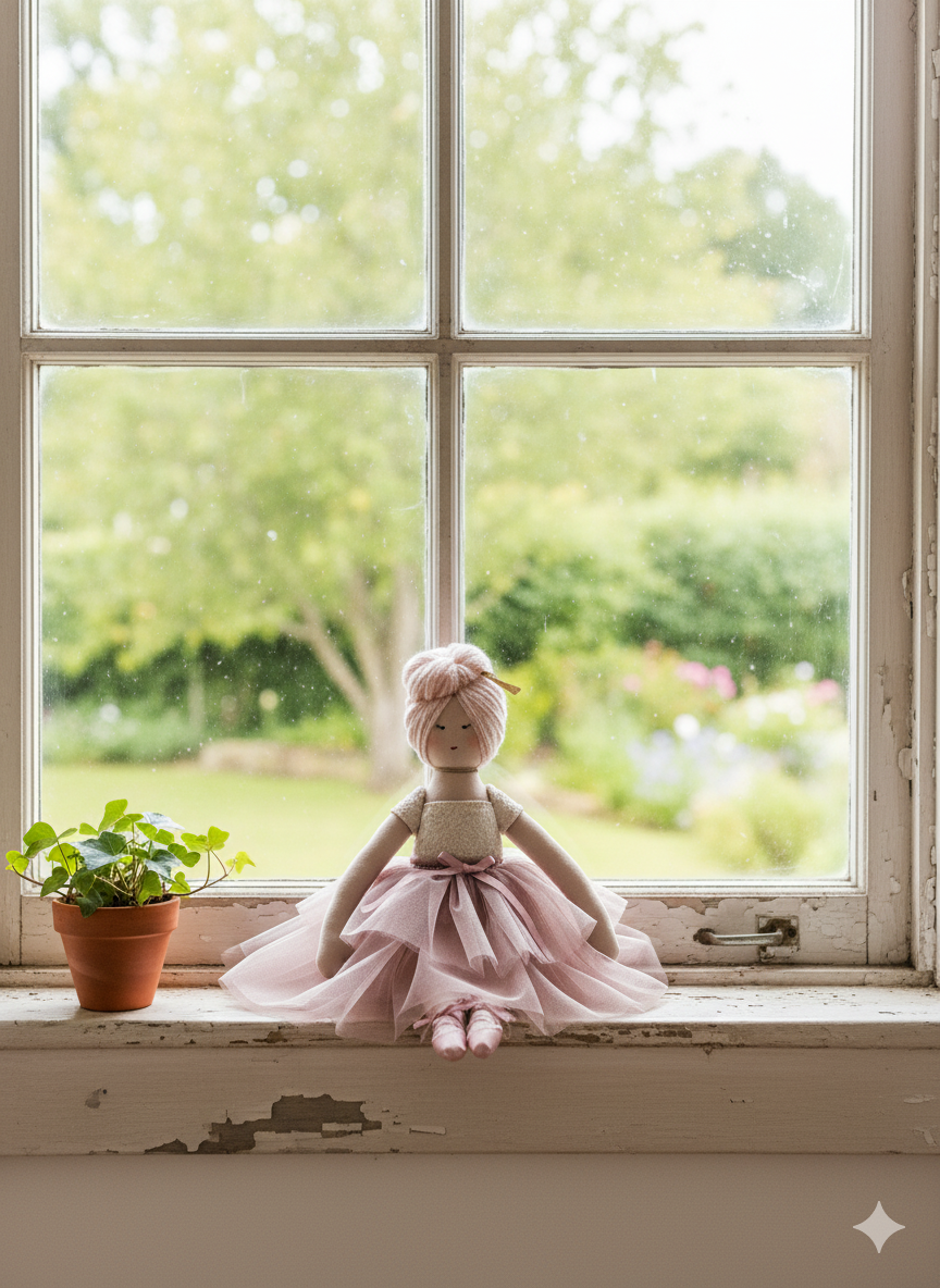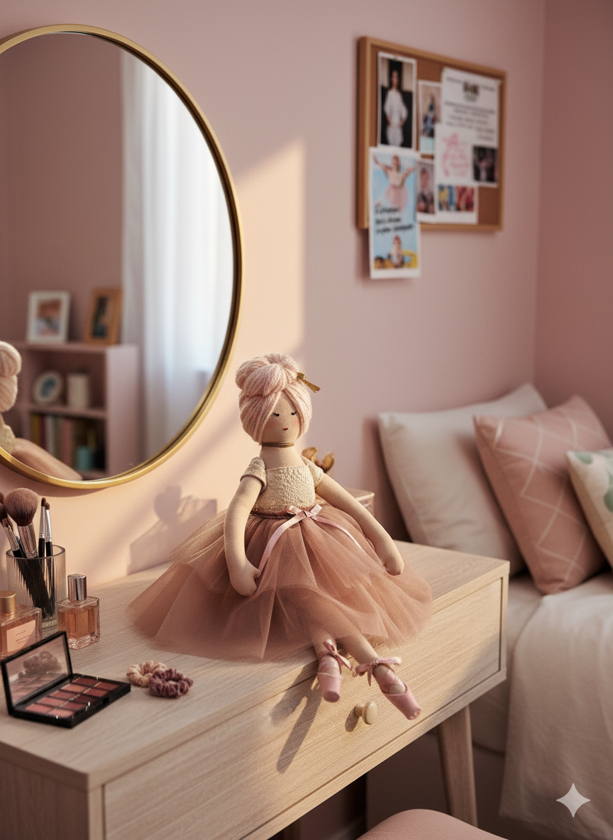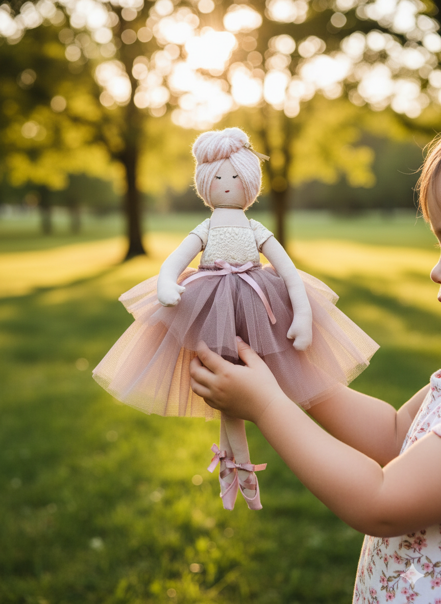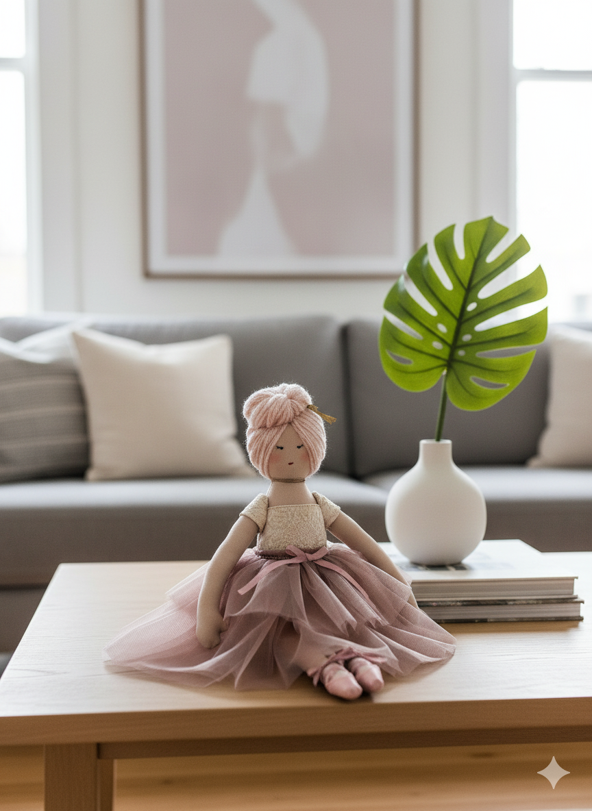 Introducing Rose Blush Ballerina, a truly enchanting cloth doll radiating elegance and tenderness. Her sweet, hand-stitched face conveys a gentle tranquility, complemented by her beautifully styled light rosy-pink yarn hair, swept into a classic ballet bun and adorned with a subtle golden embellishment. Rose is dressed in an exquisite ensemble featuring a delicate cream-colored bodice with a textured, almost lace-like appearance, paired with a voluminous and flowing blush pink tulle tutu. The waist is cinched with a matching blush pink ribbon, adding a touch of classic ballet charm. Her tiny feet are adorned with perfectly sculpted blush pink ballet slippers. Posed gracefully, Rose Blush Ballerina is a captivating piece that brings a whisper of grace and artistry to any setting.