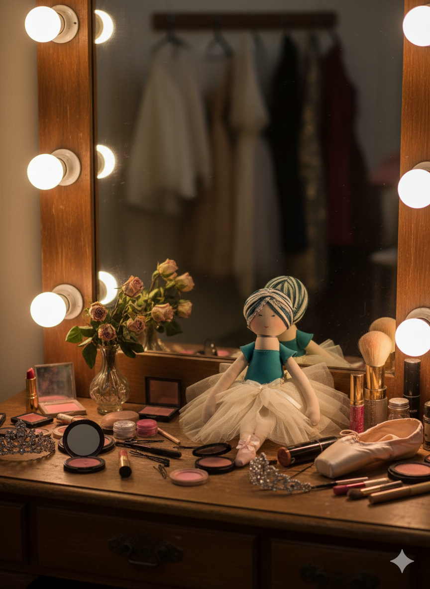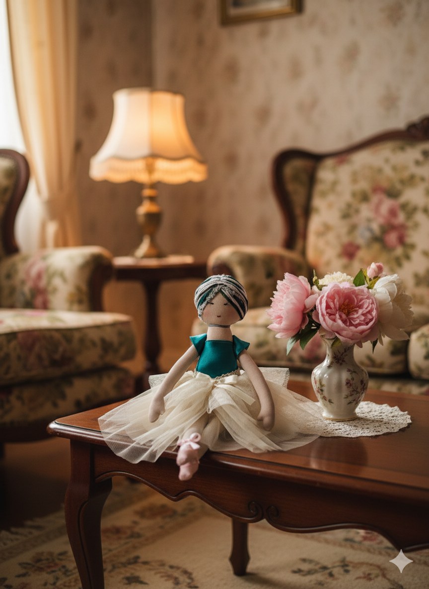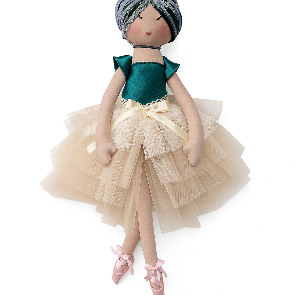Introducing Teal Tulle Dream, a charming and elegant cloth doll with a whimsical, modern aesthetic. Her serene, hand-stitched face is beautifully framed by a striking bun of teal and grey-striped hair, making her a truly unique statement piece. She is dressed in a brilliant emerald green satin leotard with delicate cap sleeves, which creates a stunning contrast with her full, multi-layered tutu in a soft champagne color. The waist is elegantly highlighted with a lace trim and a lovely cream-colored bow. Her graceful look is completed by classic light pink satin pointe shoes tied with matching ribbons. Whether she’s sitting in a cozy vintage room or resting by a glamorous vanity, Teal Tulle Dream is a captivating doll that blends sophisticated color and ballet charm.